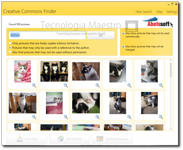 CCFinder es un programa para encontrar imágenes, pero nos hace la tarea muy fácil ya que posee filtros para encontrar las mejores imágenes, podremos buscar y/o filtrar las imágenes por; aquellas que están disponibles para usos comerciales, y las que necesitar decir quien es su autor original, etc.
