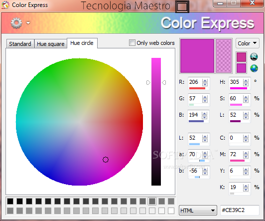 Color Express es un pequeño pero muy útil programa que cuenta con la tarea de ayudarnos a identificar colores y crearlos. La manera en la que funciona es muy sencilla, al entrar en el programa lo primero que veremos será una paleta con todos los colores existentes y que con una barra en lateral derecho podremos ir funcionando, hasta llegar al color deseado, el color que nos valle quedando en la fusión, lo podremos representar en HTML por ejemplo; #6FCEFA.